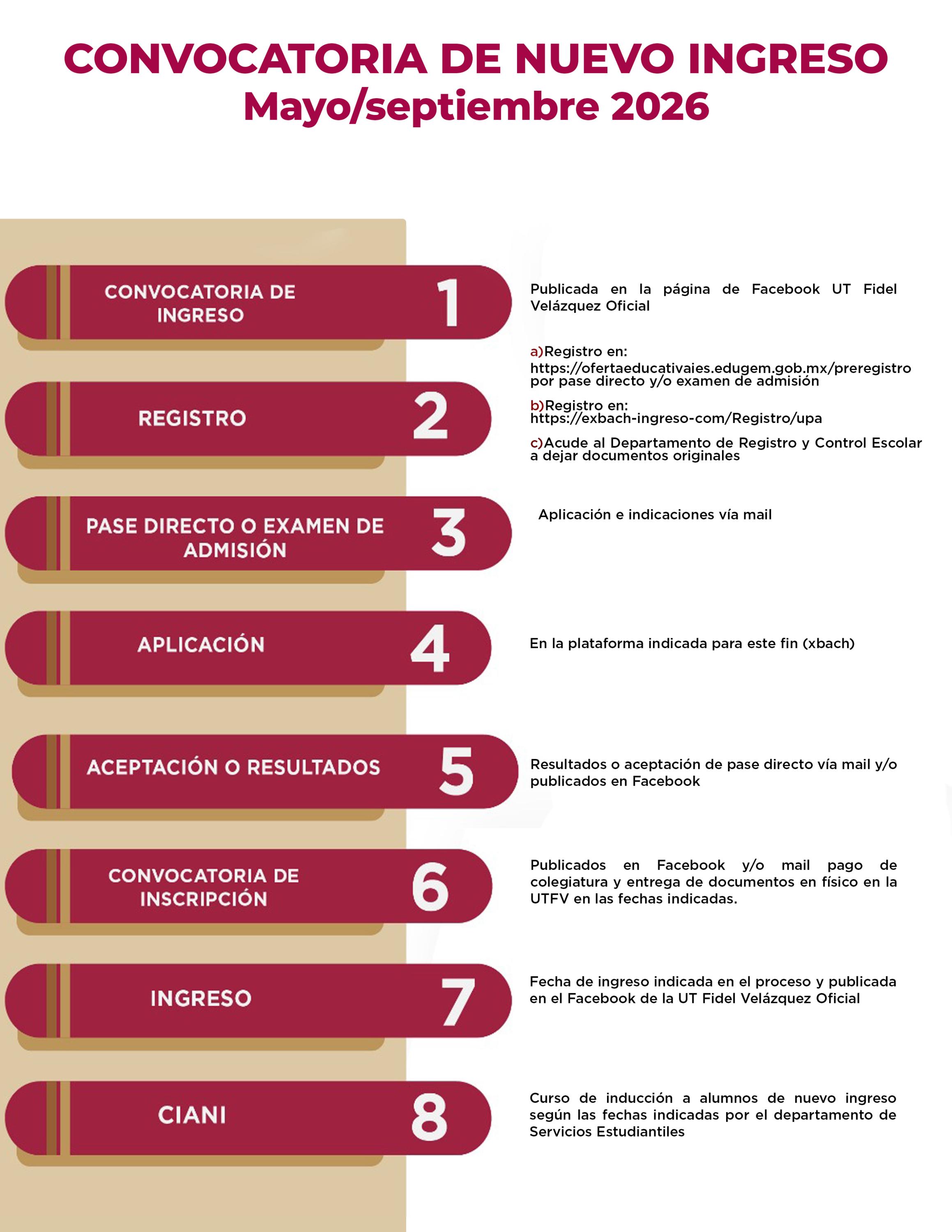 La Universidad Tecnológica Fidel Velázquez atiende de forma continua con información a todas aquellas personas interesadas en el ingreso a nuestra Institución. En el Módulo de Información para Nuevo Ingreso te atendemos de lunes a viernes de 9:00 a 17:00 hrs., ubicado en el Edificio H (Vinculación), puerta 3 de la Universidad. En Módulo encontrarás información y orientación acerca de la admisión y la Oferta Educativa. También contamos con las líneas de atención telefónica 2649 31 58, 59 y 73.